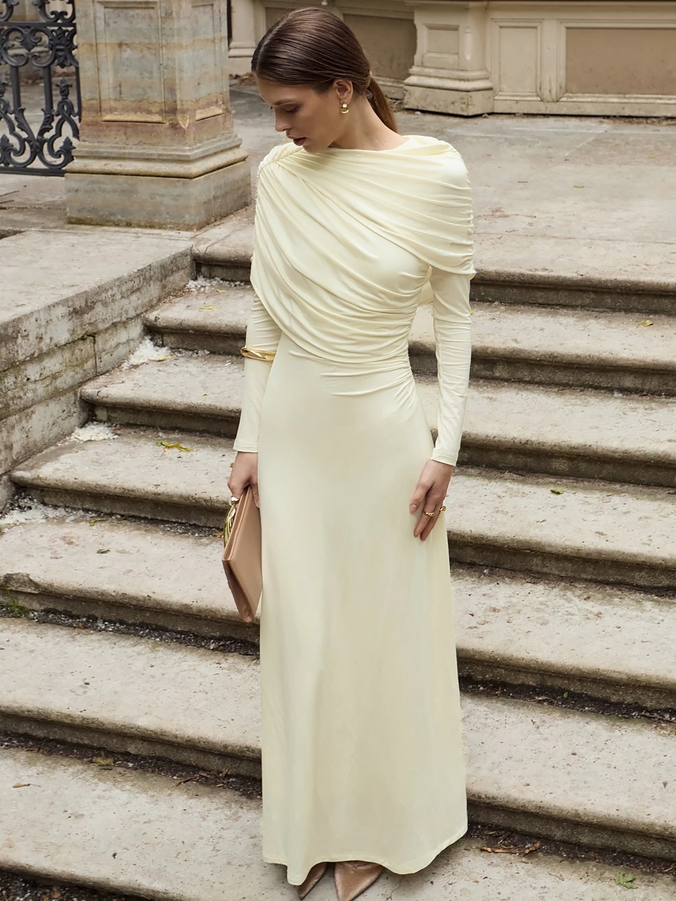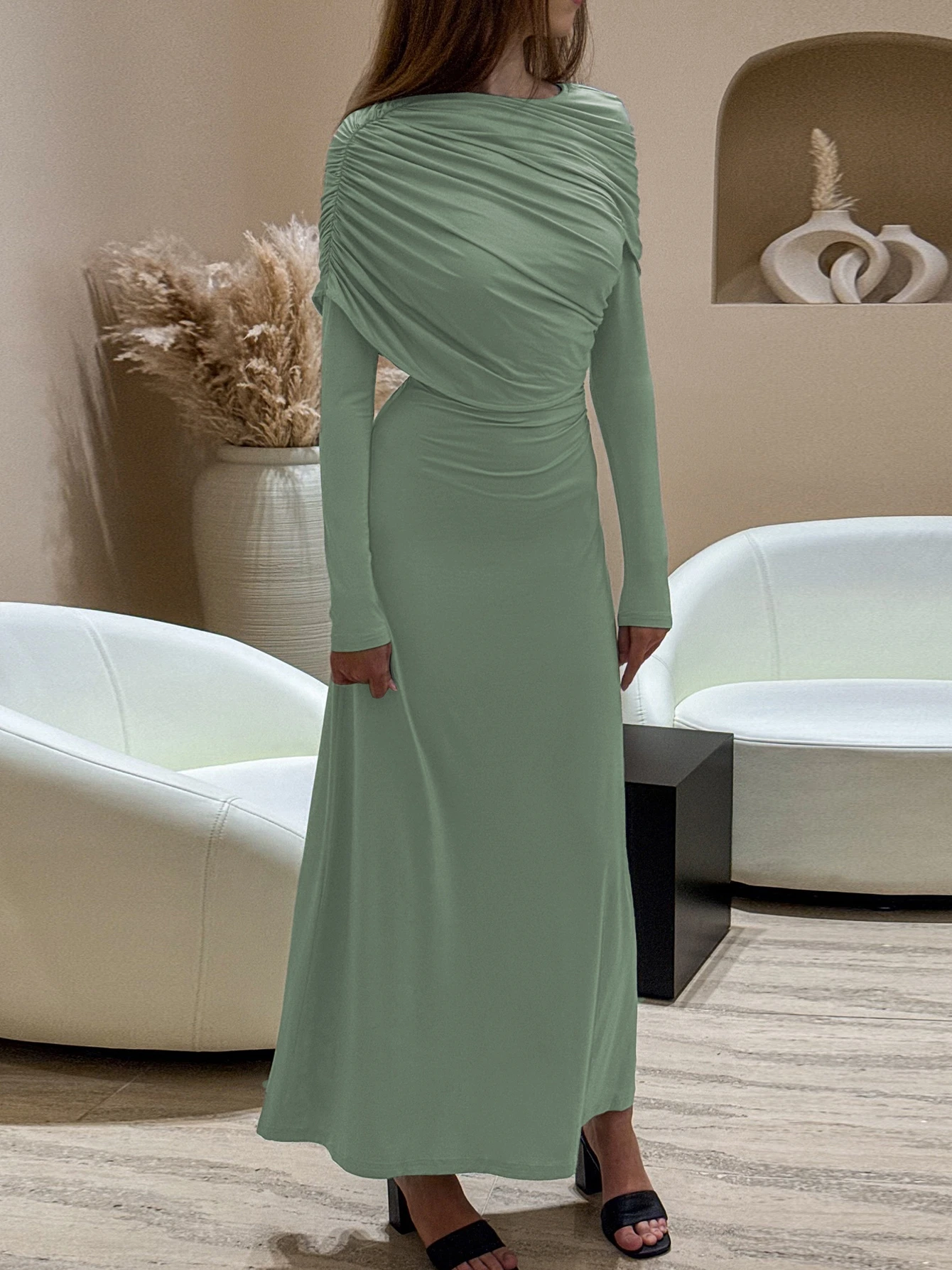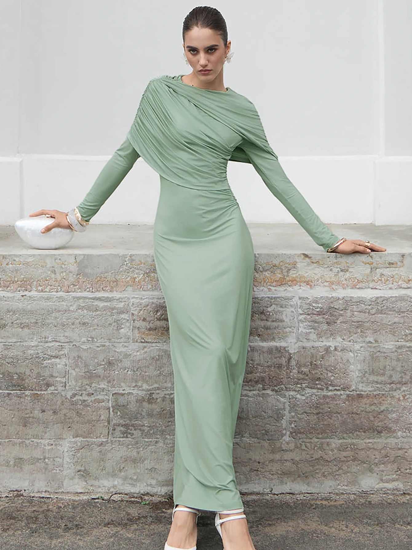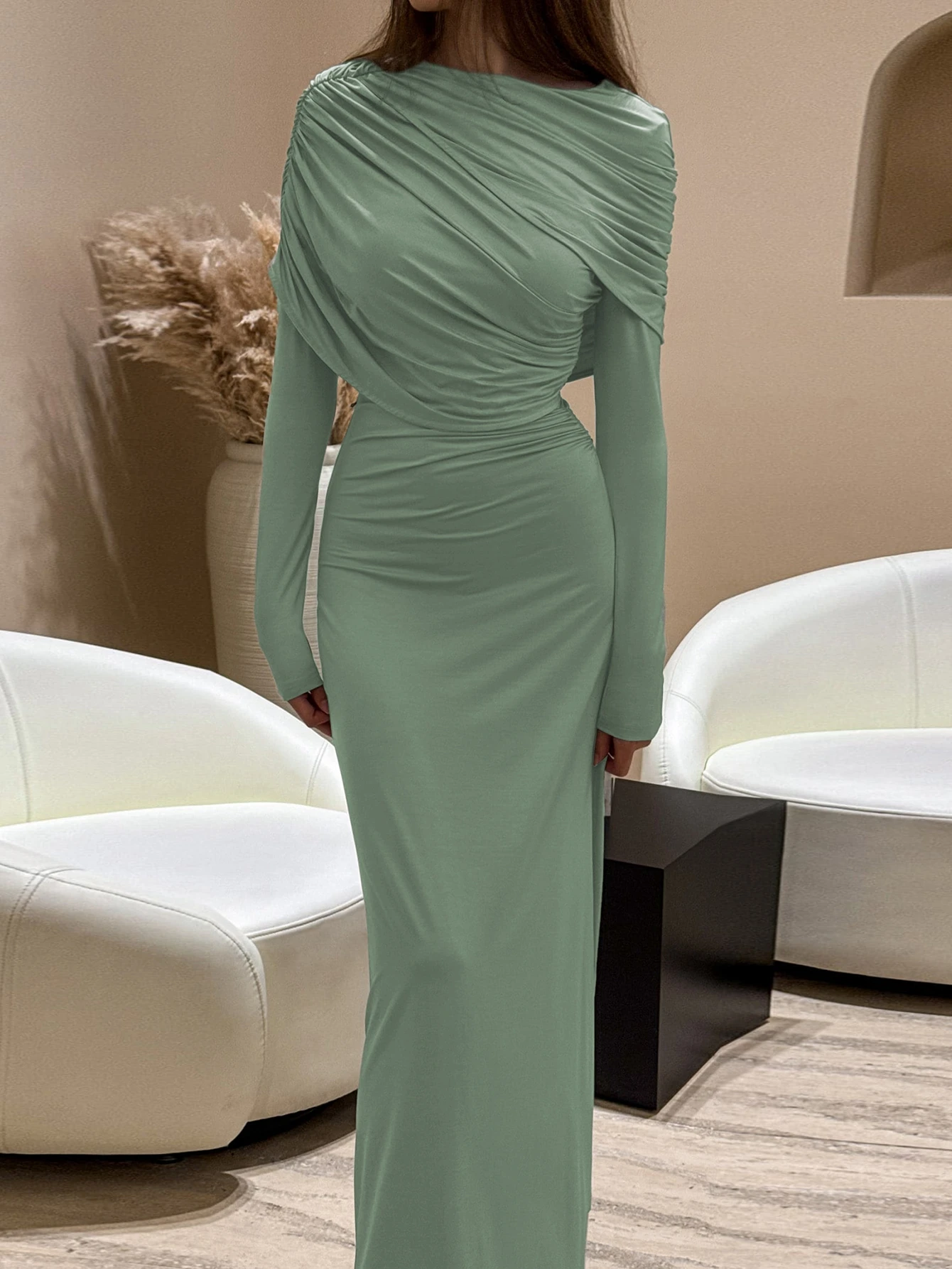 Make a bold, elegant statement this autumn with this stunning floor-length dress designed to flatter the figure with effortless grace. Crafted from a smooth polyester–spandex blend, it offers a gentle stretch that enhances comfort while maintaining a beautifully sculpted slim fit. The classic O-neckline and full garment sleeves create a refined, balanced look, while the ruched detailing adds a touch of texture and sophistication.