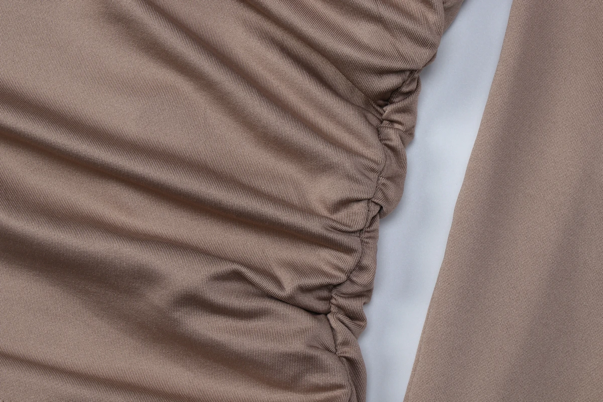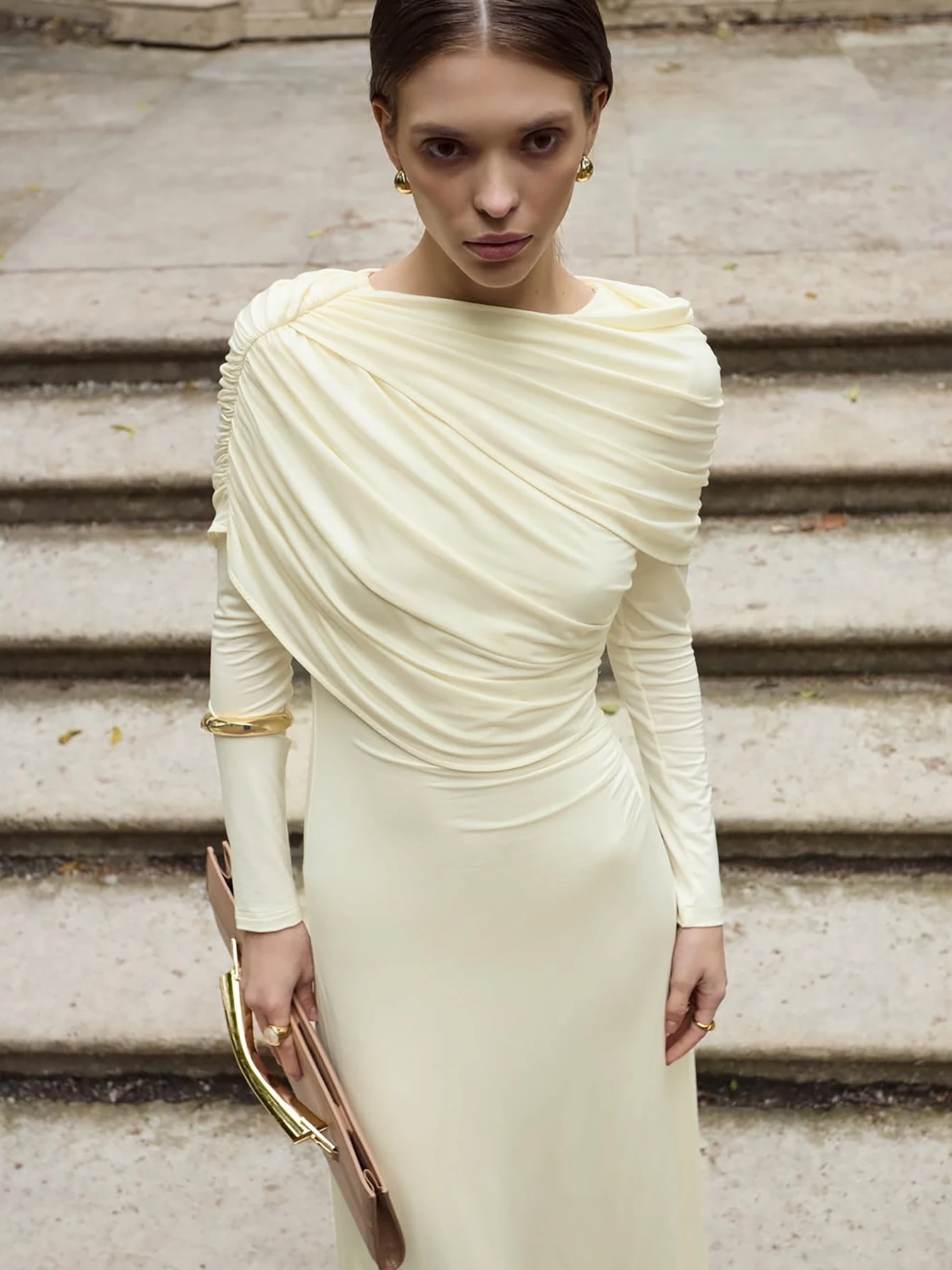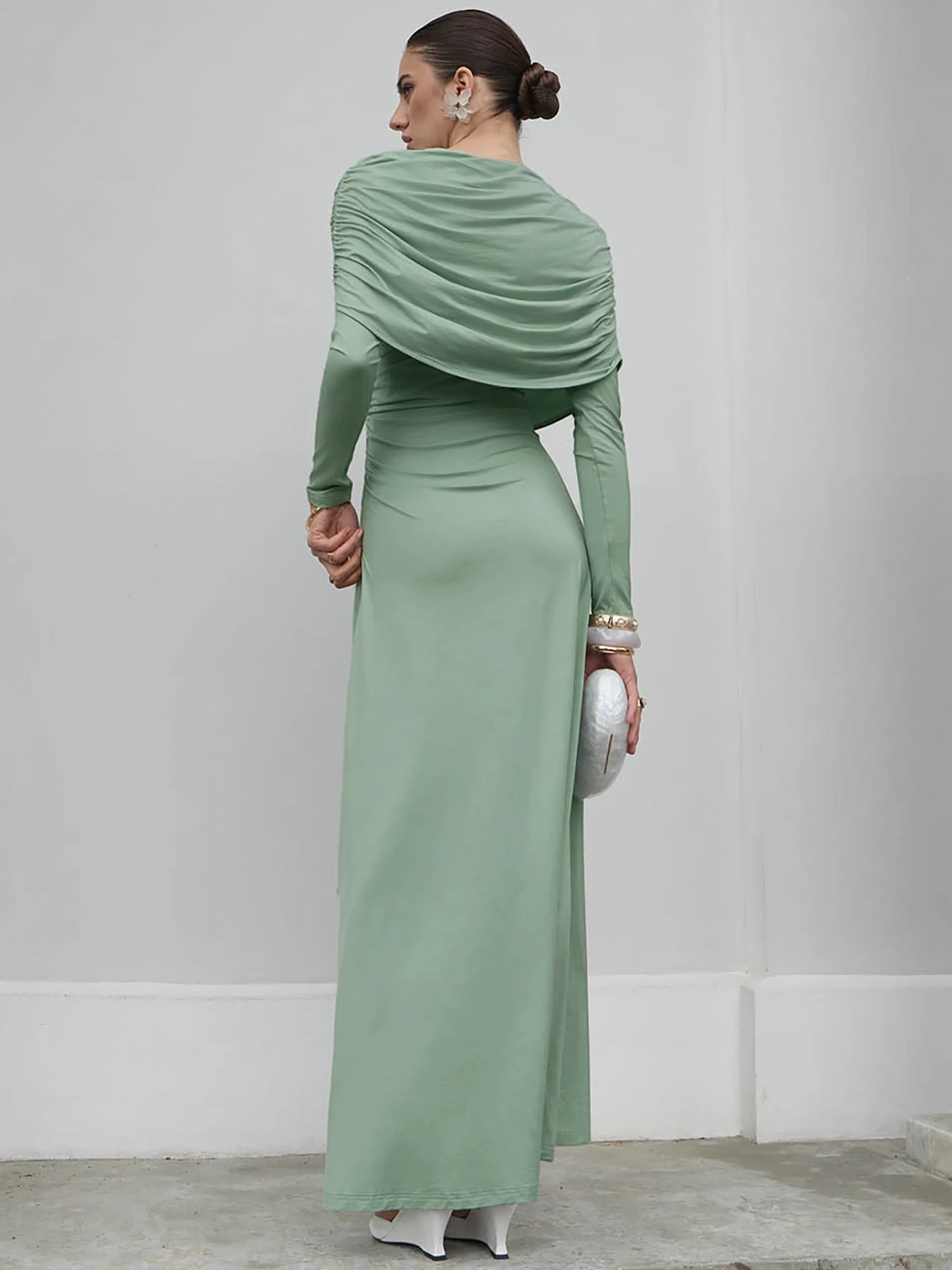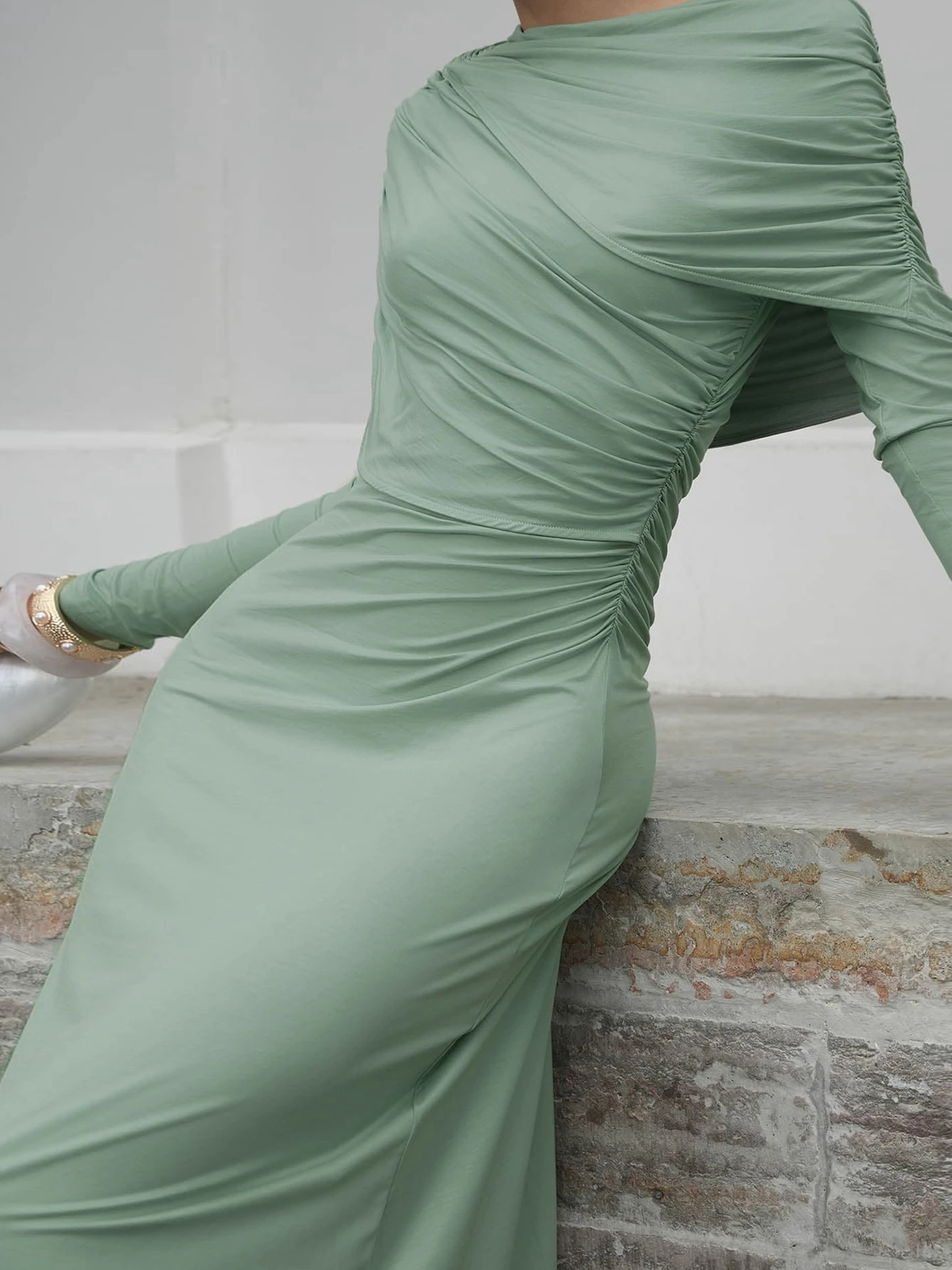 Make a bold, elegant statement this autumn with this stunning floor-length dress designed to flatter the figure with effortless grace. Crafted from a smooth polyester–spandex blend, it offers a gentle stretch that enhances comfort while maintaining a beautifully sculpted slim fit. The classic O-neckline and full garment sleeves create a refined, balanced look, while the ruched detailing adds a touch of texture and sophistication.