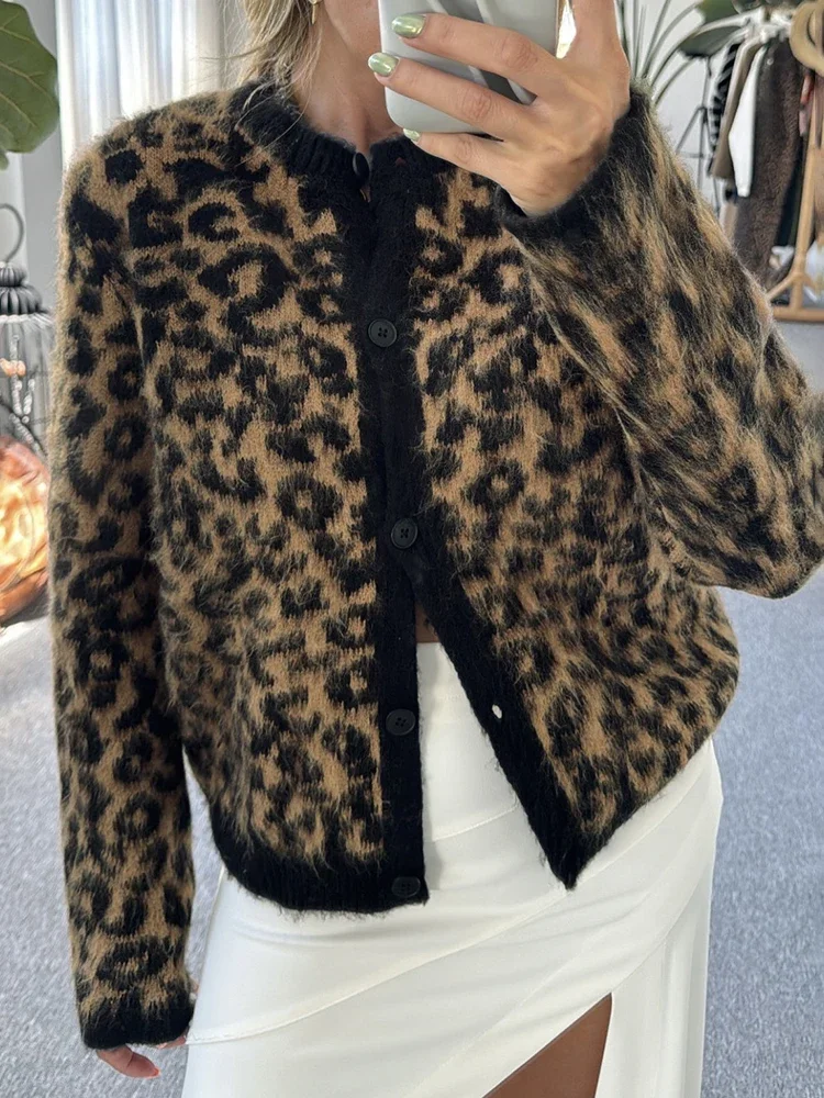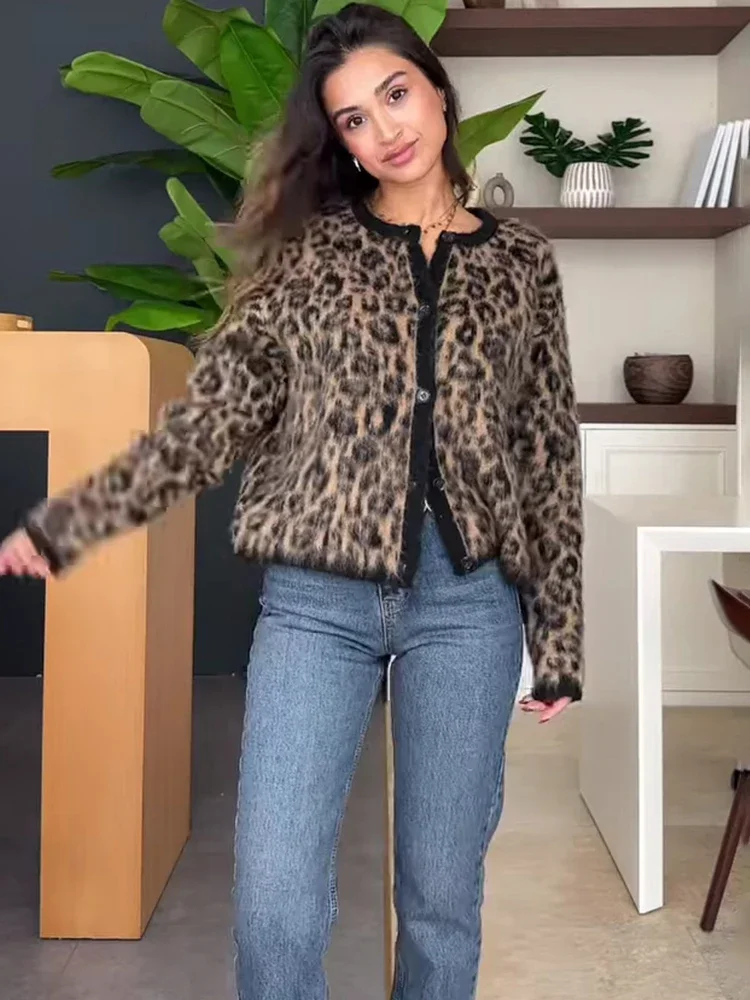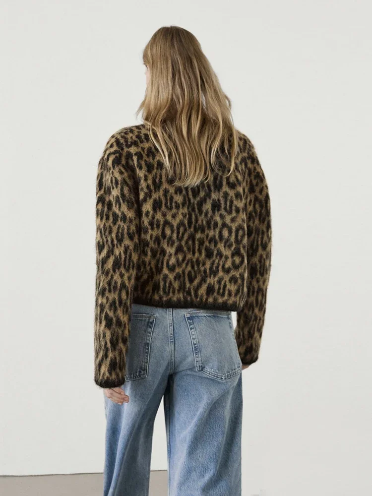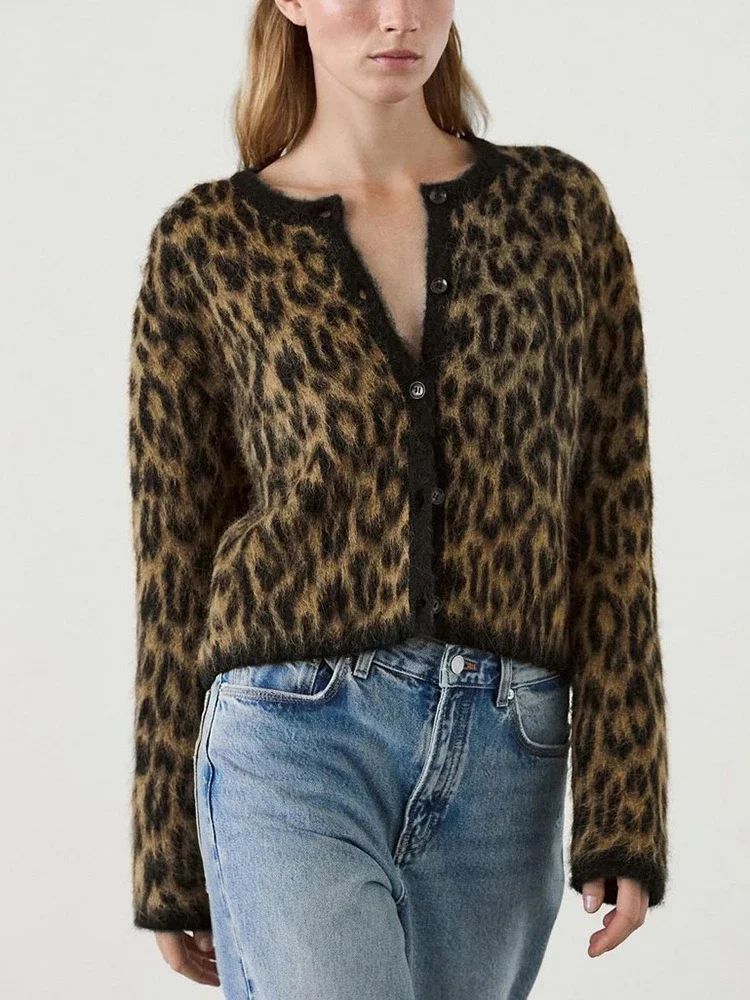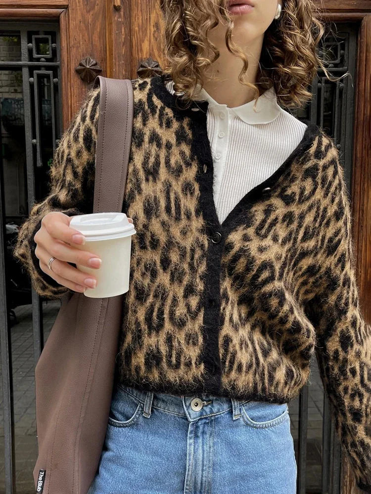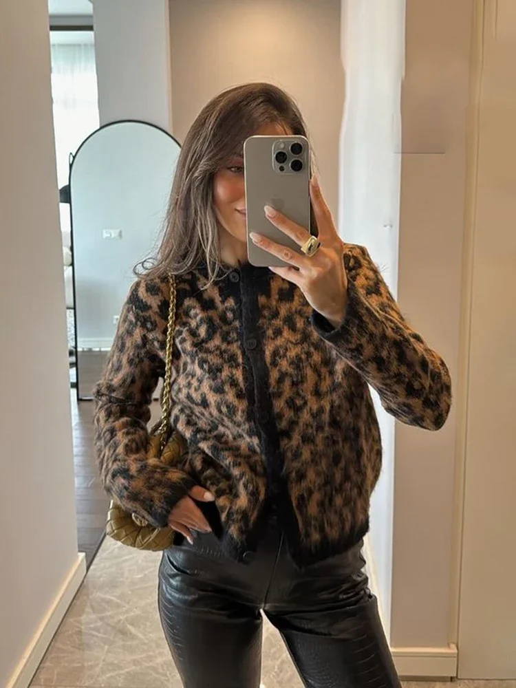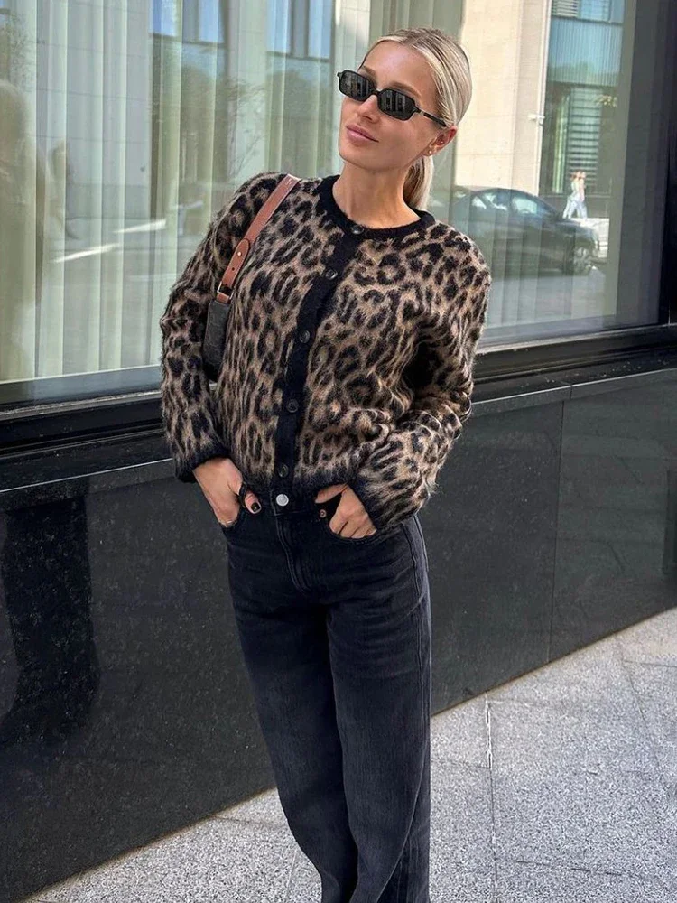 The bold leopard pattern adds a confident edge, while delicate button detailing enhances its fashionable charm. With full-length sleeves and a relaxed silhouette, this piece is ideal for layering or wearing on its own—perfect for anyone who loves combining comfort with standout style.